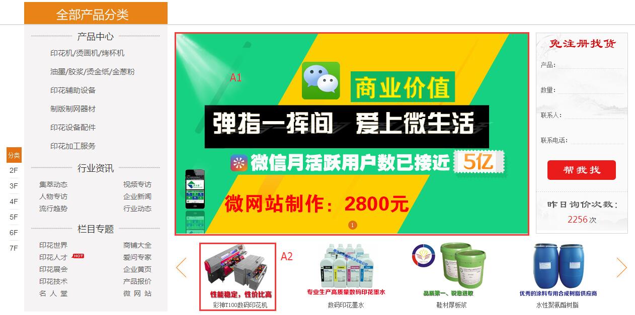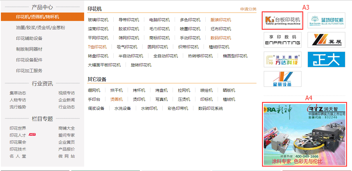 (A3/A4區(qū)這個(gè)位置是鼠標(biāo)移動(dòng)到印花機(jī)產(chǎn)品這欄目后彈出,當(dāng)移動(dòng)到材料這一產(chǎn)品欄目會(huì)更換對(duì)應(yīng)的廣告位,該位置放對(duì)應(yīng)企業(yè)logo,比如設(shè)備欄目的話 廣告位只能放有提供印花設(shè)備的企業(yè)。)