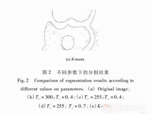 在JSEG 的圖像分割算法中,用戶可以根據(jù)圖像的特點(diǎn)調(diào)節(jié)閾值。圖2 ( b)、( c) 表明,區(qū)域合并閾值對(duì)由外部光線所引起的同種顏色內(nèi)部的過分割現(xiàn)象有良好的抑制作用,表明算法具有一定的魯棒性。圖2( c)、( d) 表明,顏色量化的閾值直接影響到是否能夠正確地劃分出顏色的種類,得到分割的初始輪廓。通過實(shí)驗(yàn)得出一般顏色量化的閾值為 225,區(qū)域合并的閾值為0. 4。在實(shí)際使用過程中,根據(jù)圖像的特點(diǎn)進(jìn)行相應(yīng)的微調(diào),當(dāng)圖像中各區(qū)域的顏色比較相近時(shí),應(yīng)該將Tc 調(diào)小,增加量化的顏色數(shù)目,使得相近的顏色區(qū)域得到分割;當(dāng)某個(gè)圖像分割出現(xiàn)顏色過分割時(shí),應(yīng)該將Tc 調(diào)大,減少量化的顏色數(shù)目,同時(shí)能夠抑制一些由于光線引起的亮度干擾;當(dāng)圖像的同種顏色內(nèi)部有過分割的現(xiàn)象,可以將Tr 調(diào)大,使得相同顏色的區(qū)域合并,達(dá)到理想的分割效果。