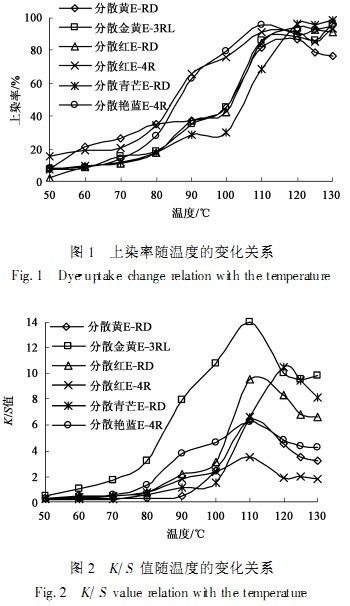采用2種類型6只染料,分別為分散紅ERD,分散黃ERD,分散青芒ERD,分散金黃E3RL,分散艷藍E4R和分散紅E4R在質量分數(shù)為2%(o.w.f)、硫酸銨質量濃度為1g/L、用冰醋酸調(diào)節(jié)pH值到5、浴比50:1的條件下,在不同溫度將麂皮絨恒溫染色1h(100℃和100℃以上,由于存在升溫過程,所以100℃保溫45min,110℃時保溫42min,120℃時保溫38min,125℃時保溫36min,130℃時保溫34min),然后分別測定它們的上染率和K/S值,測試結果見圖1、2。