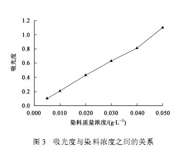 用移液管吸取0.1g/L的分散紅ERD母液25、20、15、10、5、2.5mL,分別置于50mL的容量瓶中,加N,N二甲基甲酰胺至刻度,并按1~6順序編號。選擇中間檔濃度的染料在分光光度計上測其最大吸收波長(λmax),然后以該波長測定1~6號容量瓶中各染液的吸光度,見圖3。
