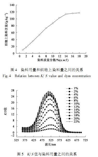 在硫酸銨為1g/L、用冰醋酸調(diào)節(jié)pH值到5、浴比50:1的條件下,采用不同質量分數(shù)的分散紅ERD對麂皮絨進行染色,以3℃/min的速率從室溫升至50℃,然后以1℃/min的速率升至90℃,保溫20min,再以1℃/min的速率升溫至120℃保溫50min,然后以1℃/min的速率下降到70℃;最后在80℃min用2g/L的Na2CO3和2g/L的凈洗劑清洗20min。之后測定織物的K/S值和染料含量,結果分別見圖4和圖5。