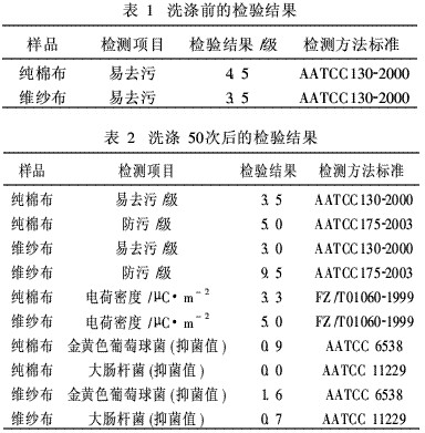 取市售白色機(jī)織純棉斜紋面料和市售白色機(jī)織維紗(VISA)斜紋面料,分別用有效物質(zhì)量分?jǐn)?shù)為10%的AL-12整理液進(jìn)行整理,送國家紡織制品質(zhì)量監(jiān)督檢驗(yàn)中心(中國紡織科學(xué)研究院測試中心)進(jìn)行功能檢驗(yàn)。檢測數(shù)據(jù)表見表1和表2。