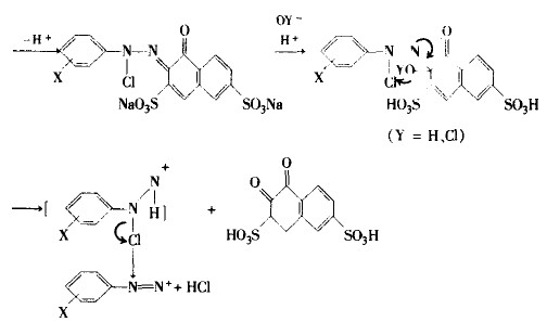 活性氯存在于自來水中,水質愈差,通入氯氣愈多,對活性染料的耐氯牢度要求就愈高;钚月瓤墒谷旧镒儭⑼噬@首先發(fā)生在纖維表面。其機理是,帶正電荷的氯原子攻擊纖維表面染著的染料,使染料分子氧化分解,造成偶氮基斷裂,如圖 1所示: