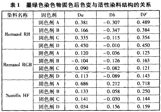 (2)色變與活性染料的結構有關,但規(guī)律性不強。用Remazol RR、Remazol RGB和Sumifix HF等三種染料分別染色、固色得到的深色染色物,以及用Sumifix Supra EXF、Cibacron FN和 Levafix CA等三種染料分別染色、固色得到的中色染色物,都表現(xiàn)出這種規(guī)律性不強的情況。例如染墨綠色(深色),在用相同固色劑的情況下,用Remazol RGB的色變最小,即DF最小,且顏色更綠;用Remazol RR染料染色和固色的色變除了固色劑A 之外,色變最大,色更紅、更藍;用Sumifix HF的色變次之,但色更黃(見表1)。