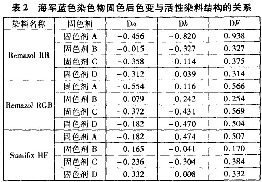 對海軍藍(深色),用Remazol RGB染料染色和固色的色變,除了固色劑A之外,色變最大,且色更紅、更黃;用Remazol RR染料染色和固色的色變次之,但色更藍、更綠;用Sumifix HF 染料染色和固色的色變最小,但色更綠、更紅(表2)。