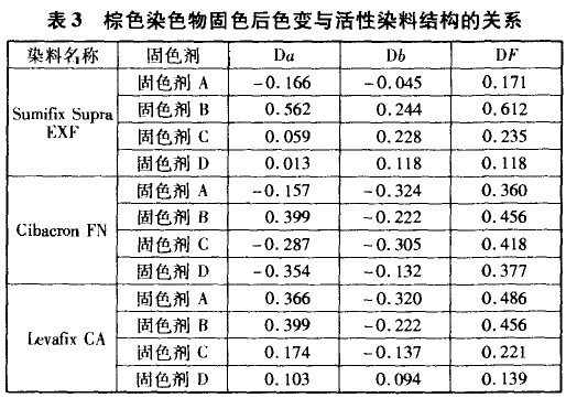 又如,對棕色(中色),用Sumifix Supra EXF染料染色和固色的色變,除了固色劑B之外最小,且色更黃;用Levafix CA染料染色和固色的色變,除了固色劑A之外次之,但色更紅;用 Cibacron FN染料染色和固色的色變最大,但色更綠(見表3)。