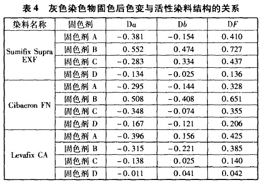 對灰色(中色),用kvafix CA染料染色和固色的色變,除了固色劑A之外,色變最小,但色更綠;用Cibacron FN染料染色和固色的色變次之,但色變更藍,用Sumifix Supra EXF染料染色和固色的色變,除了固色劑D之外最大,但色更綠、更紅 (見表4)。