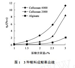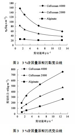 圖2、3分別為3%含固量的各原糊的黏度曲線和流變曲線。由此可見,3種原糊都是假塑性流體,其中Cellcosan2000、Cellcosan4000原糊的假塑性很明顯,而海藻酸鈉糊接近牛頓流體,其黏彈性比前兩者差。