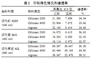 由結(jié)果可知,用Cellcosan系列糊料印花花紋得色情況與海藻酸鈉糊料得色情況相近,滲透性優(yōu)于海藻酸鈉。