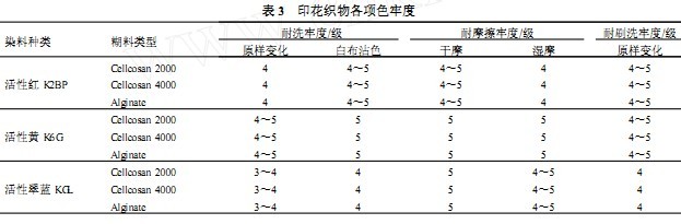 3種活性染料印花織物的各項(xiàng)色牢度如表3所示,結(jié)果表明用高取代CMC糊料印花的色牢度與海藻酸鈉糊料的色牢度基本一致,均達(dá)到了國家標(biāo)準(zhǔn)。