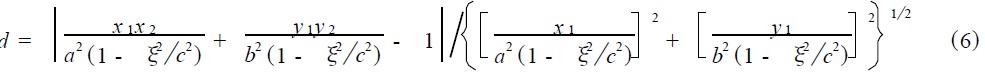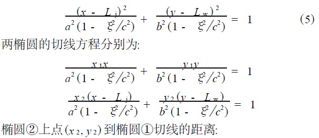 由圖1 可知, 最小印花網(wǎng)點(diǎn)應(yīng)大于壓縮織物組織點(diǎn)橢圓之間所能容納的最大圓, 其直徑為兩對應(yīng)橢圓的兩切線之間距。若橢圓①的方程為式(2) , 則橢圓②的方程可用式(5) 表示: