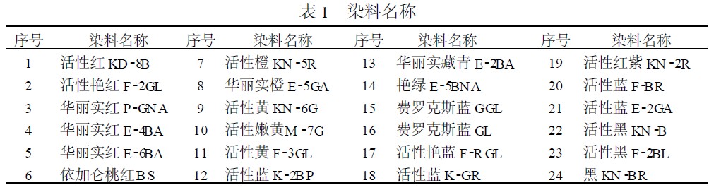 根據(jù)染料色樣卡(陜西安康絲織印染廠提供) , 首先由目測篩選黃3 種、品紅9 種、青9 種和黑3種列于表1。為了保證網(wǎng)點(diǎn)疊合時不產(chǎn)生化學(xué)變化, 每組染料均采用同類活性染料。