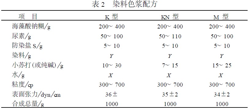 按照活性染料的類型(K型、KN型和M型) 不同, 色漿的處方略有區(qū)別, 見表2。表中染料的用量Y為總量的4% , 水的用量X 使總量達(dá)到1000 g。其粘度用旋轉(zhuǎn)式粘度計測定, 表面張力用鈕簧式表面張力計測定。