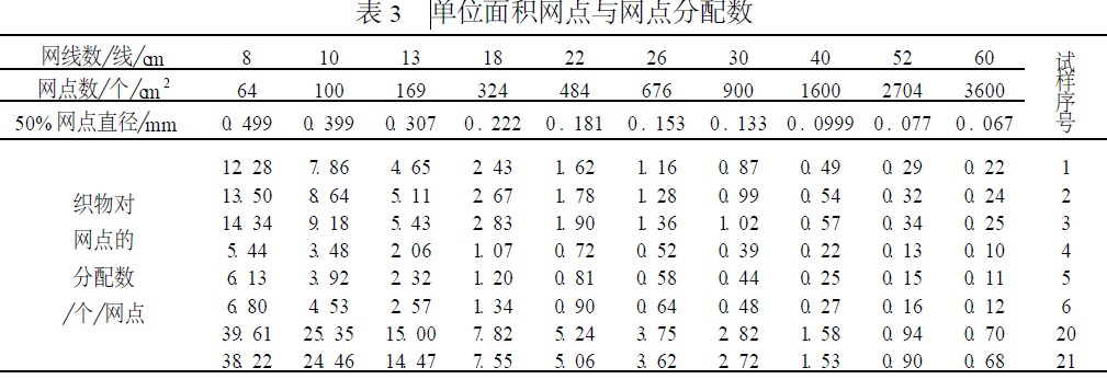 由文獻(xiàn)[6 ]中的表4、5 可知, 織物對網(wǎng)點(diǎn)具有重新分配的作用, 其分配數(shù)的大小由支持點(diǎn)點(diǎn)數(shù)與單位面積內(nèi)網(wǎng)點(diǎn)個數(shù)的比值所決定。實(shí)驗(yàn)表明, 當(dāng)此值大于等于0. 5 時, 加上一定的印花壓力, 可使網(wǎng)目印花樣的層次損失降低到最小程度。表3 中折線右邊的數(shù)均小于0. 5, 該織物不能選其所對應(yīng)的加網(wǎng)線數(shù)進(jìn)行印花。要用該織物印花, 必須選表3 中左邊的數(shù)所對應(yīng)的網(wǎng)線數(shù)(即分配數(shù)大于0. 5) 進(jìn)行網(wǎng)點(diǎn)印花, 才能保證印花質(zhì)量。