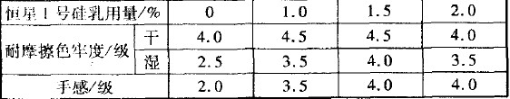 2.1 恒星1號(hào)硅乳用量對(duì)印花牢度及手感的影響在涂料色漿中加入不同用量的恒星l號(hào)硅乳,印花后測(cè)試其耐摩擦色牢度,并進(jìn)行手感評(píng)定(見表1)。