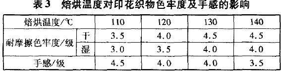 焙烘處理可使黏合劑與織物發(fā)生交聯(lián),并將涂料包覆黏附在織物上。焙烘溫度低,黏合劑不能充分交聯(lián);溫度太高,則織物發(fā)黃,手感發(fā)硬,且浪費(fèi)能源,增加生產(chǎn)成本。因此,焙烘溫度是影響織物牢度性能的主要因素。在恒星l號(hào)硅乳用量1.5% ,焙烘時(shí)間2 min的條件下,試驗(yàn)不同焙烘溫度對(duì)織物牢度性能和手感的影響,結(jié)果見表3。