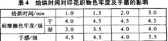表4為在恒星硅乳用量1.5% ,焙烘溫度130度條件下,不同焙烘時(shí)間對(duì)印花織物牢度性能和手感的影響。