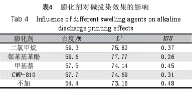 為提高汽蒸時(shí)堿的滲透和增強(qiáng)纖維的溶脹,選擇耐堿性的滲透劑和滌綸膨化劑為堿性拔染的助拔劑,考察對堿拔染效果的影響。當(dāng)氫氧化鈉質(zhì)量分?jǐn)?shù)為10%、汽蒸溫度120℃、汽蒸時(shí)間25 min時(shí),3種3%的耐堿性滲透劑和4種0.33%的膨化劑對堿拔染效果的影響見表3和表4。