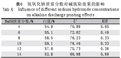 由表5可知,低濃度時(shí),隨著鄰苯基苯酚質(zhì)量分?jǐn)?shù)的增加,白度和明度增加,K/S值下降,堿拔白效果較明顯。當(dāng)質(zhì)量分?jǐn)?shù)超過0.21%時(shí),堿拔白效果的變化不大,不再隨著質(zhì)量分?jǐn)?shù)的增加而增加。這是因?yàn)?.21%的膨化劑已足以使纖維溶脹,此時(shí)堿劑和助劑易進(jìn)入纖維,再增加用量作用不明顯。另外,當(dāng)鄰苯基苯酚質(zhì)量分?jǐn)?shù)較高時(shí),堿性拔白漿的成漿困難,漿容易出現(xiàn)塊狀粘結(jié)。因此,控制鄰苯基苯酚質(zhì)量分?jǐn)?shù)為0.21%。