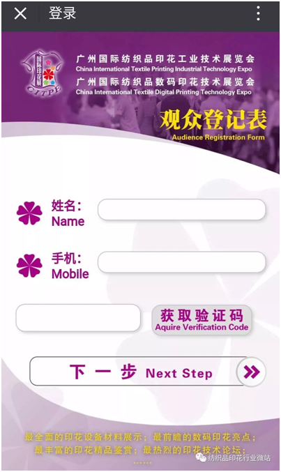 觀眾可關(guān)注展會(huì)微信公眾號(hào)“紡織品印花行業(yè)微站”進(jìn)行觀眾預(yù)登記入場(chǎng)參觀