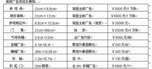 ★ 會(huì)刊廣告: 會(huì)刊——將幫助您在展會(huì)后找到客戶(hù)!除在展會(huì)期間廣為發(fā)送外,還通過(guò)各種有關(guān)渠道發(fā)送給未能前來(lái)參觀展會(huì)的各地專(zhuān)業(yè)人士手中,他們可利用會(huì)刊迅速查找聯(lián)絡(luò)方法與服務(wù)內(nèi)容。(會(huì)刊規(guī)格為130mm×210mm,廣告費(fèi)一律預(yù)收一次性付清;因故不能參展企業(yè),亦可選擇在會(huì)刊及展場(chǎng)廣告宣傳。)
