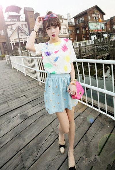 【集萃網(wǎng)觀察】 百搭的白色T恤簡約好看,寬松的款式可以幫MM們遮住難看的贅肉,搭配印花短裙,整體搭配很是小清新甜美。