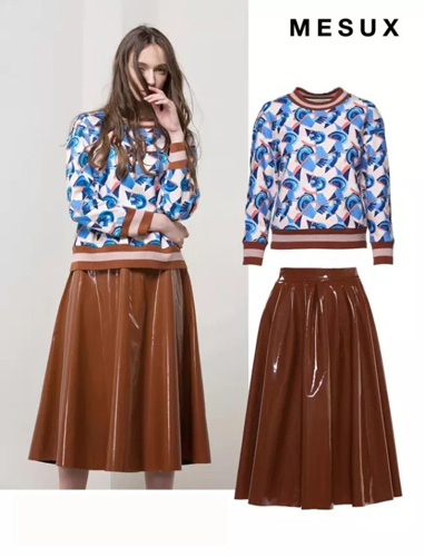 柔韌而富有空間感的滌羊毛,柔軟親膚舒適。棕色和粉色的條紋毛衫拼接于領(lǐng)口和袖口處,配合通身的冷色印花,秉持MESUX一貫的平衡設(shè)計(jì)理念,使冷暖色的比例平衡協(xié)調(diào)。搭配極易打理的棕色PU折疊百搭半裙,將時(shí)尚與舒適融合,經(jīng)典與當(dāng)代融合,形成獨(dú)一無二的你。