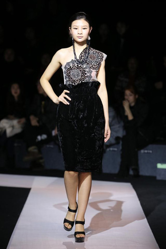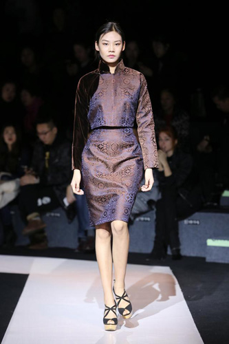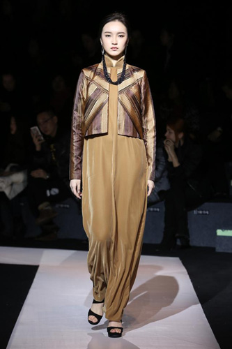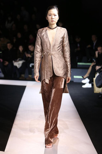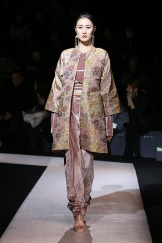 本系列將蒙古傳統(tǒng)裝飾印花與現(xiàn)代時(shí)尚服飾完美結(jié)合、突出色彩和層次感。運(yùn)用傳統(tǒng)蒙古服飾中的立領(lǐng)、盤(pán)口、刺繡等元素,結(jié)合當(dāng)下大熱的絲絨面料、金絲面料、簡(jiǎn)潔的剪裁手法將時(shí)尚與傳統(tǒng)民族風(fēng)格保持完美平衡。