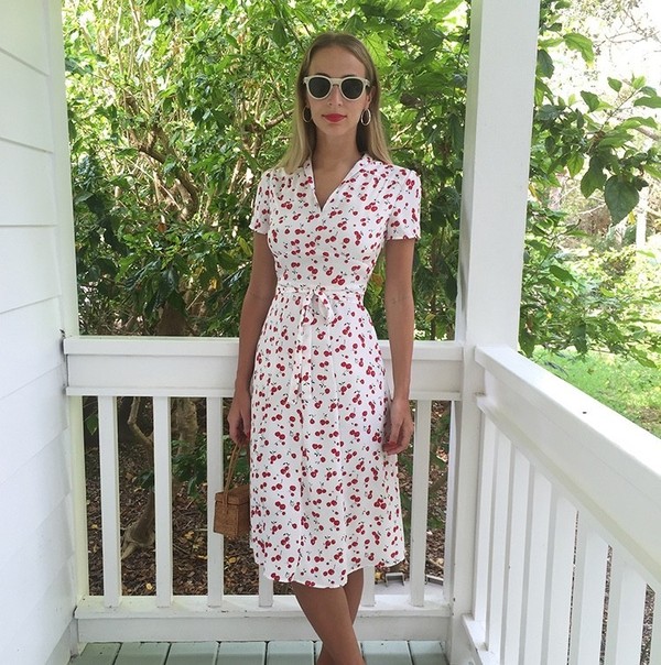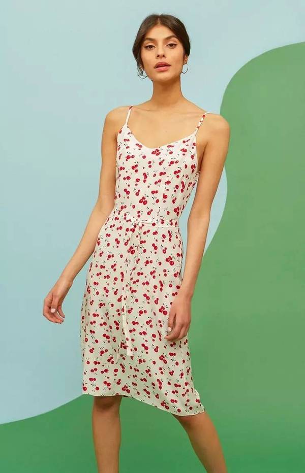 莉莉·奧爾德里奇紐約街拍演繹HVN櫻桃印花吊帶裙搭配CHOLE平底鞋