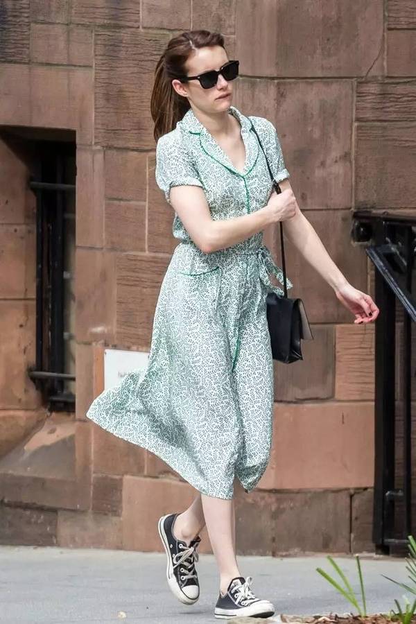 艾瑪·羅伯茨紐約街拍演繹HVN絲質(zhì)襯衫裙搭配匡威運動鞋