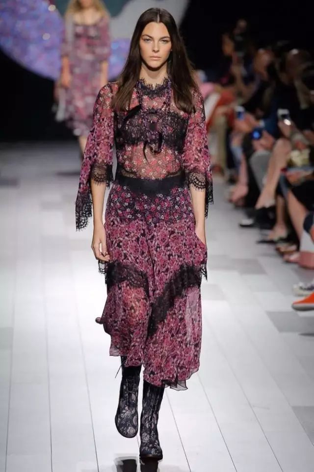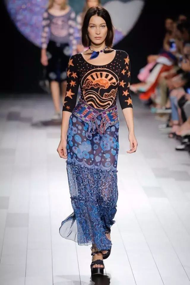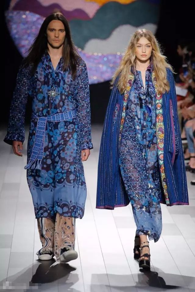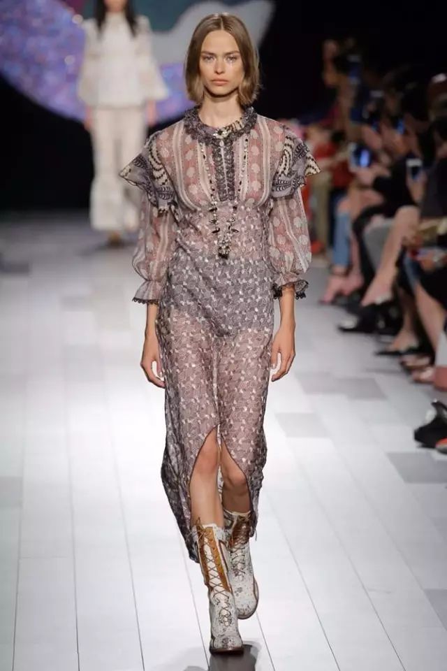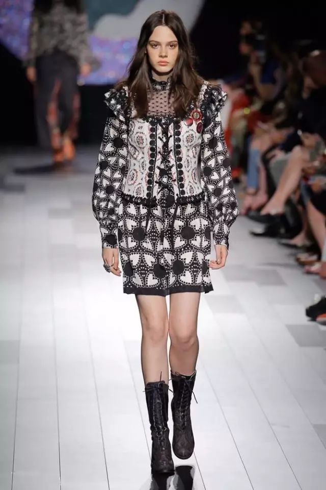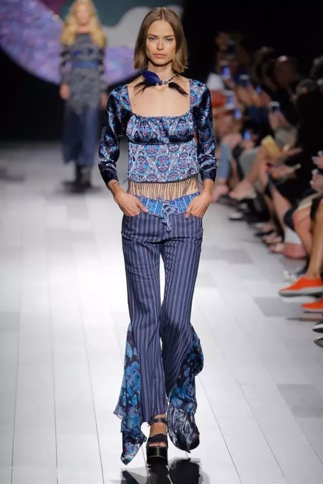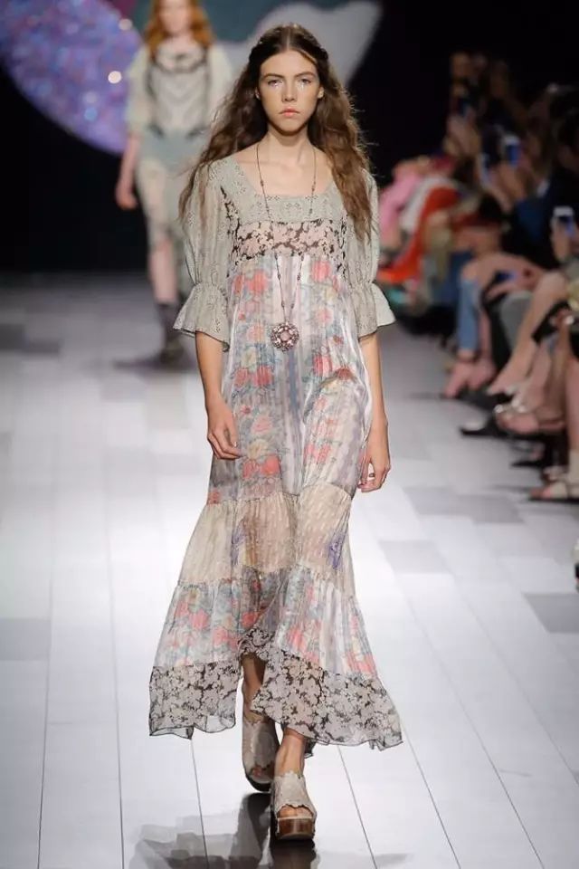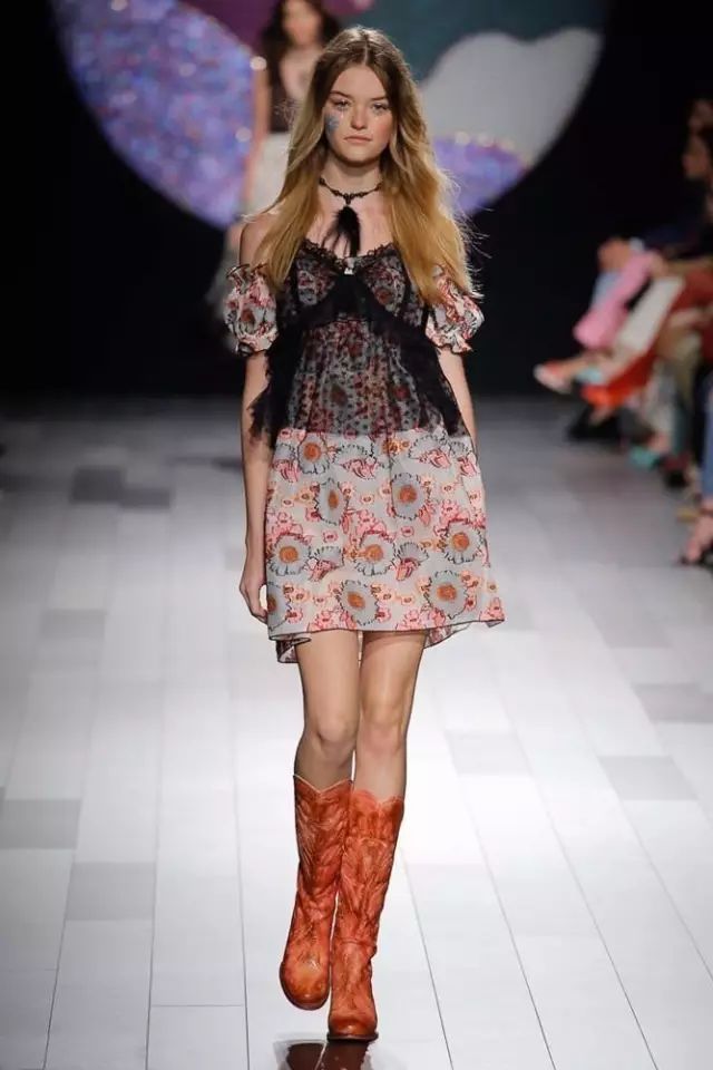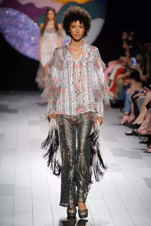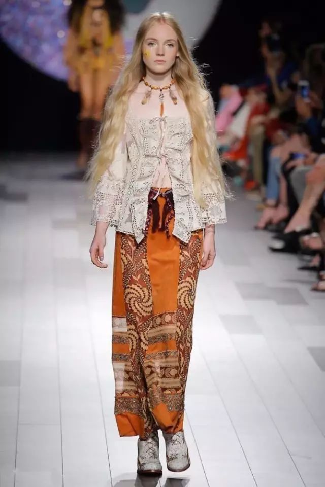 【集萃網(wǎng)觀察】在 Anna Sui2018春夏系列上,民族風(fēng)的印花刺繡貫穿全場(chǎng),讓模特化身異域少女,神秘又充滿活力。嬉皮士風(fēng)的喇叭褲,波西米亞的印花高靴,浪漫的輕紗荷葉邊,打造酷勁十足又不失仙氣的俏皮少女風(fēng)。