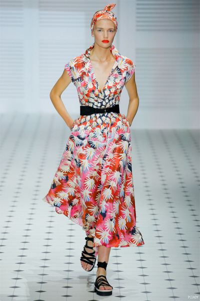一向愛用蕾絲和刺繡的Temperley London在本次系列中運用大面積印花來呈現(xiàn)一場雞尾酒禮服派對。充滿熱帶風(fēng)情的連衣裙在花簇的襯托下透露著濃厚的熱帶風(fēng)情,而抽象的線條與暗格紋在一定程度上詮釋了波普藝術(shù)的美感。