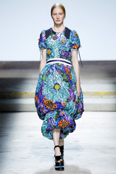 “I‘m an 80s baby!”,這是Mary Katrantzou的自我宣言。帶著這樣的自我認(rèn)知,她將自己對童趣的理解發(fā)揮到設(shè)計中,于是本季的印花系列就產(chǎn)生了。色彩斑斕的大花元素,與涂鴉手繪式線條融合,極具浪漫主義色彩的同時不失精細(xì)的匠心工藝。大廓形式下擺也是她的代表元素之一,提供了更廣闊的想象空間。
