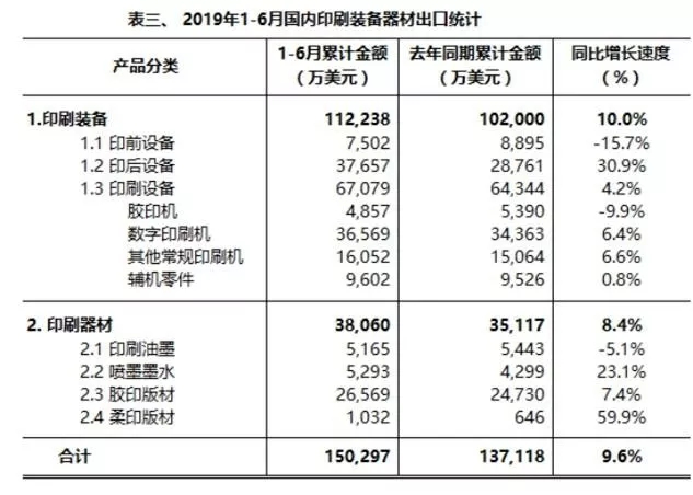 2019年1月—6月,國內(nèi)印刷裝備出口11.22億美元,同比增長10.0%。