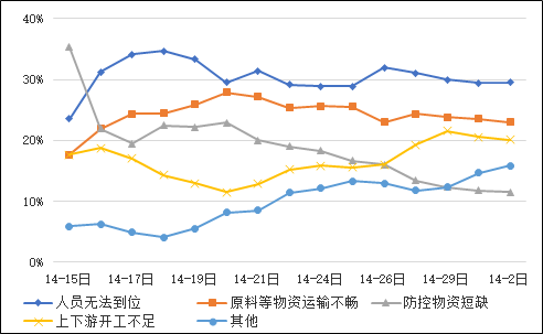 隨著時(shí)間發(fā)展,企業(yè)面臨的問(wèn)題也在發(fā)生著變化。2月中旬,很多企業(yè)處于復(fù)工準(zhǔn)備階段,防控物資短缺是企業(yè)面臨的最大問(wèn)題;隨著企業(yè)逐步復(fù)工,人員無(wú)法到位、物資運(yùn)輸不暢成為企業(yè)復(fù)工復(fù)產(chǎn)中面臨的前兩大困難;臨近2月底,防控物資短缺的問(wèn)題已逐步得到解決,由于產(chǎn)業(yè)鏈復(fù)工不同步,上下游開(kāi)工不足的情況增長(zhǎng)迅速,與此同時(shí),隨著時(shí)間推移,企業(yè)在資金、貸款、社保等其他方面的問(wèn)題開(kāi)始涌現(xiàn),面臨的問(wèn)題更加多元化。