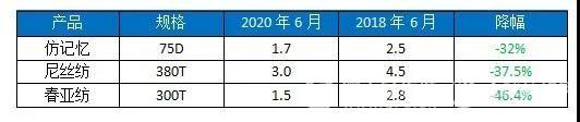 自2019年行情開始走下坡路以來,坯布價格也不斷地向下走,這是眾所周知的。但價格下降的幅度到底有多大,下面我們用75D緯捻仿記憶這款坯布為例,具體來看。2018年的價格是2.5元/米,隨著行情和原料價格的下降,2019年則已降為1.9元/米,到現(xiàn)在價格僅在1.7元/米!坯布價格下降幅度為32%,這也很好地驗證了布老板的感嘆:2年前的坯布價卻成為今年的成品價!
