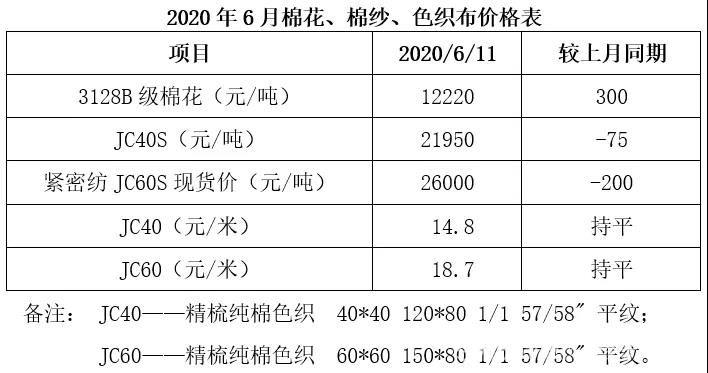 2020年5月中旬以來,國內(nèi)外棉花期貨價(jià)格震蕩上行,國內(nèi)棉花現(xiàn)貨價(jià)格跟漲。6月12日,國內(nèi)3128B級(jí)棉花現(xiàn)貨均價(jià)為12220元/噸,較上月同期上漲300元/噸,漲幅略有升高。據(jù)調(diào)查了解,目前近一半紡企的原料庫存在一個(gè)月左右,原料采購意愿較弱,以剛需為主。紗線市場整體較上月有所好轉(zhuǎn),常規(guī)普梳棉紗銷售相對(duì)較好,高支純棉紗交易依舊清淡。5月底前,高支純棉紗價(jià)格低位持穩(wěn),進(jìn)入6月份,價(jià)格略有下滑,跌幅較上月收窄。由于下游需求不足,原料持續(xù)上漲,紡企利潤空間不斷壓縮,部分企業(yè)已在虧損邊緣,大多選擇低價(jià)走貨,庫存壓力依然未減。色織市場