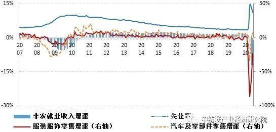 數(shù)據(jù)來源:美國人口普查局 通常情況下,消費(fèi)品根據(jù)其需求彈性不同,對于收入或價格變動表現(xiàn)出不同的消費(fèi)量變化。比如,家具、電器、汽車等屬于需求彈性相對較高的耐用消費(fèi)品,當(dāng)個人收入減少時,更新耐用消費(fèi)品的支出計劃更容易被推遲。而服裝消費(fèi)中除了少量奢侈品,主體是滿足日常需求的非耐用必須品,需求彈性相對較低。從美國近20年的零售數(shù)據(jù)來看,食品、服裝等非耐用品消費(fèi)零售具有更強(qiáng)的穩(wěn)定性,在經(jīng)濟(jì)低迷、收入下降的情況下,通常呈現(xiàn)零售下降緩慢、降幅較小的特點,耐用消費(fèi)品零售則下降更為顯著;反之在收入加快增長時,耐用消費(fèi)品需求增長速度也提升更快。 2020年新冠疫情的爆發(fā)打破了這一經(jīng)濟(jì)規(guī)律,服裝成為了下降最為劇烈的消費(fèi)品,主要原因是疫情引起了消費(fèi)場景的重大改變,從而造成了消費(fèi)結(jié)構(gòu)的變化。為防止疫情蔓延,各國普遍采取了居家隔離、減少外出、禁止成規(guī)模聚集等措施。在經(jīng)濟(jì)發(fā)展達(dá)到較高水平的國家和地區(qū),服裝服飾早已超出了蔽體保暖的基本功能,更多具備了生活品質(zhì)提升、社會禮儀承載、個性風(fēng)格表達(dá)等功能。疫情以來,居家辦公、就學(xué)等防疫措施使得社會活動幾近完全中斷,辦公室、校園、會議、社團(tuán)、宴會、朋友聚會等社交場景著裝需求必然大幅度減少。相關(guān)信息顯示,美國近80%居民選擇居家辦公,消費(fèi)場景的變化造成服裝服飾消費(fèi)需求顯著下滑。當(dāng)消費(fèi)場景更多集中在居家生活中時,消費(fèi)焦點會更多的轉(zhuǎn)移到與居家生活相關(guān)的領(lǐng)域,比如疫情以來,美國居民在建筑裝修、運(yùn)動休閑等方面的支出明顯增加(見圖1)。由于美國家庭中大多擁有露臺和庭院,DIY房屋粉刷及花園修繕,購買割草機(jī)等園藝裝備,添置蹦床秋千等家庭健身器材以及戶外桌椅、燒烤器材等庭院娛樂設(shè)施,成為居家防疫期間重要的消費(fèi)增長點。 圖2:2007~2020年美國居民收入增速、失業(yè)率與部分商品零售增速