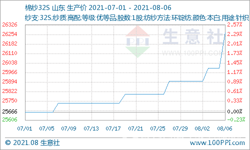 據(jù)生意社數(shù)據(jù)顯示,6日32支棉紗山東地區(qū)價格在26267元/噸左右,環(huán)比上漲2.34%,同比上漲30.03%。