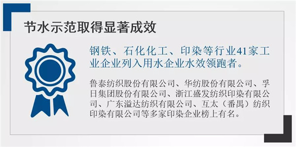 《規(guī)劃》指出,“十三五”時期節(jié)水型社會建設取得顯著成績,用水效率明顯提高,節(jié)水政策進一步完善,節(jié)水管理體系進一步健全,節(jié)水設施能力得到強化,節(jié)水示范取得顯著成效,鋼鐵、石化化工、印染等行業(yè)41家工業(yè)企業(yè)列入用水企業(yè)水效領跑者。