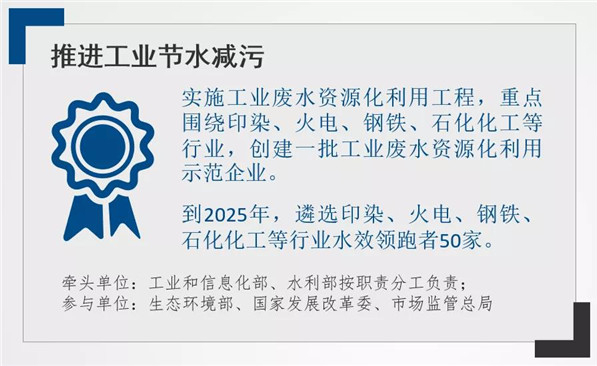 《規(guī)劃》指出,要推進工業(yè)節(jié)水減污,強化高耗水行業(yè)用水定額管理,推廣應用先進適用節(jié)水技術(shù)裝備,實施企業(yè)節(jié)水改造,推進企業(yè)內(nèi)部用水梯級、循環(huán)利用,提高重復利用率。實施工業(yè)廢水資源化利用工程,重點圍繞印染、火電、鋼鐵等行業(yè),創(chuàng)建一批工業(yè)廢水資源化利用示范企業(yè)。到2025年,遴選印染、火電、鋼鐵等行業(yè)水效領跑者50家。