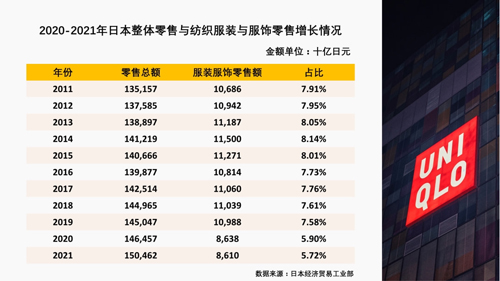 事實(shí)上,縱觀近10年日本零售市場(chǎng)發(fā)展趨勢(shì)不難看出,紡織服裝與服飾的消費(fèi)占日本整體零售消費(fèi)比重呈現(xiàn)逐年緩慢下降態(tài)勢(shì)。疫情催化下,日本本土消費(fèi)者對(duì)服裝服飾的購(gòu)買欲望一再降低,消費(fèi)復(fù)蘇缺乏后勁,難度較大。