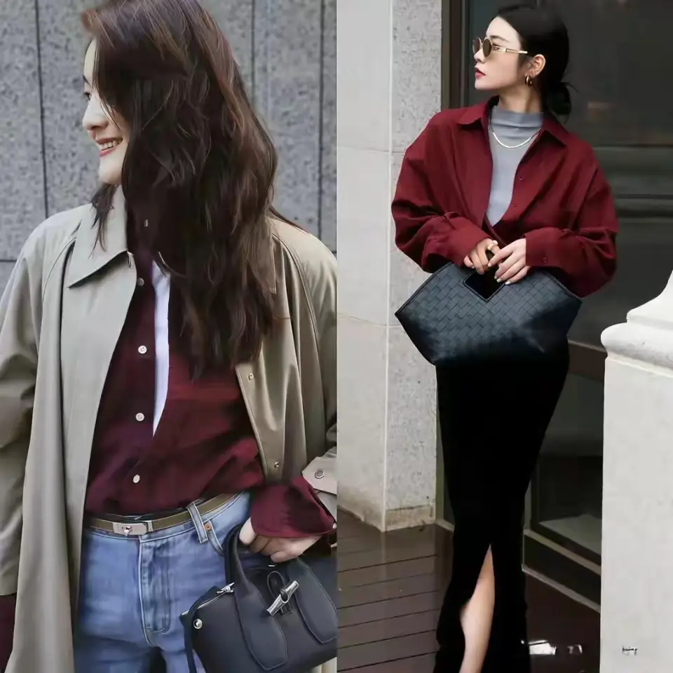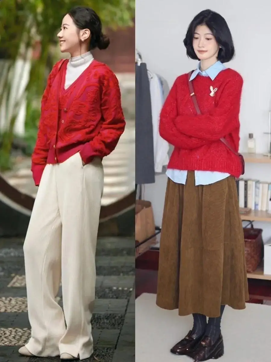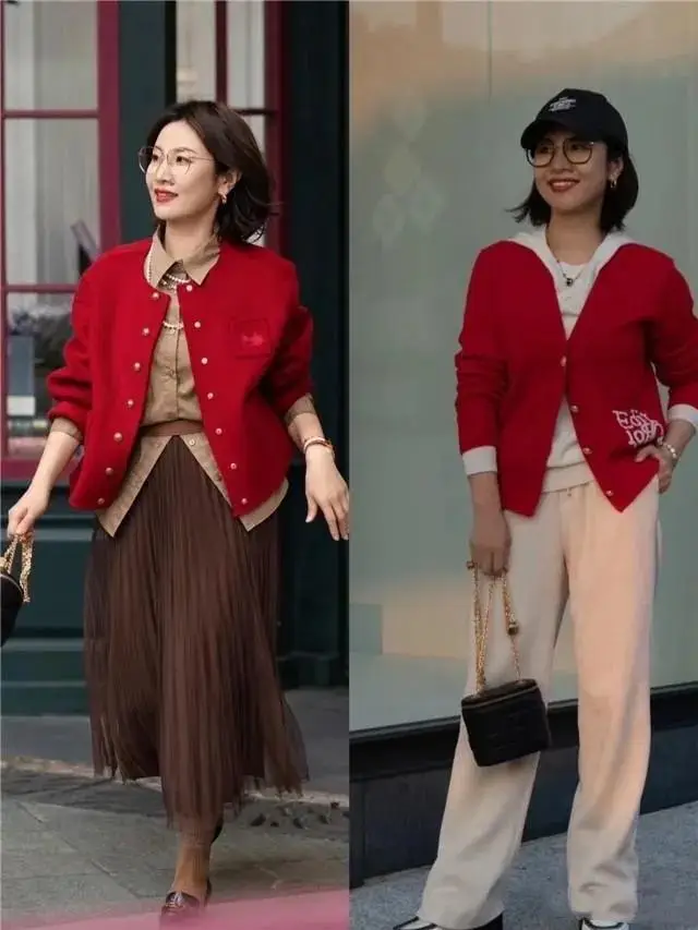 沒有選擇紅色大衣,那么我們內(nèi)搭就可以用紅色的衣服單品來組合了,這樣能讓你的造型更有層次感,例如上面用一件紅色的襯衫疊穿白色T恤,或者是灰色針織衫,瞬間讓造型變得復古洋氣。