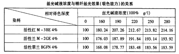 220 g/l以下的燒堿絲光,嚴(yán)格地講只是“半絲光”,根本達(dá)不到“全絲光”的穩(wěn)定效果。因而,堿濃度一旦產(chǎn)生波動(dòng),棉纖維的吸色能力便會(huì)發(fā)生變化。所以,“半絲光”處理的染色半制品,很容易產(chǎn)生深度與色光的波動(dòng)。以下檢測(cè)數(shù)據(jù)足以證明: