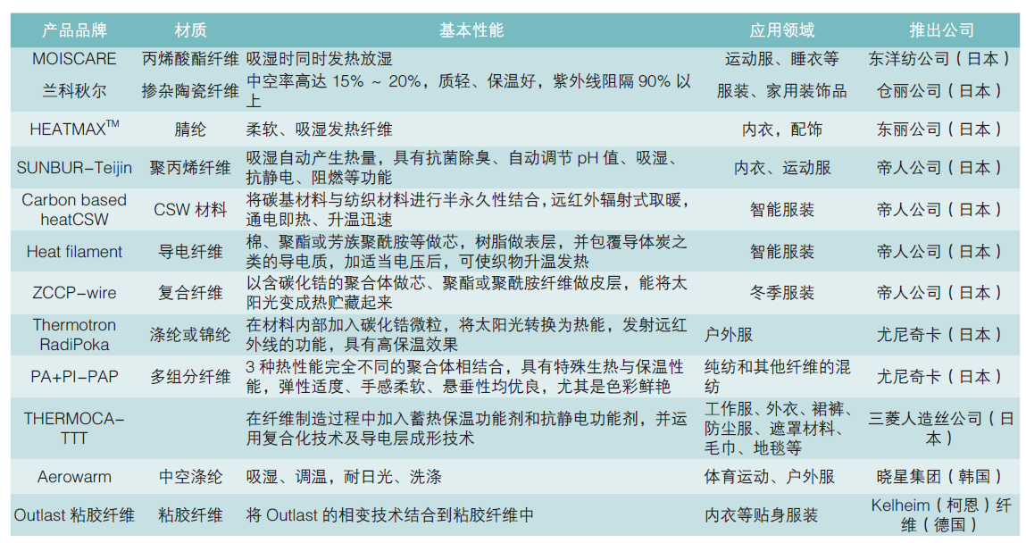各種發(fā)熱保暖纖維也可在保暖領(lǐng)域使用,如日本小松精練公司將紅外線吸收劑和玻璃微珠添加到聚合物中,制成了保溫纖維DynaLive,該纖維制成的服裝內(nèi)部溫度比一般織物高3~7℃;東洋紡集團(tuán)旗下EXLAN工業(yè)公司生產(chǎn)的丙烯酸酯纖維“依克絲”、富士紡HD公司的ECOWARM吸濕發(fā)熱纖維通過吸收人體釋放出的水蒸汽等水分而使纖維發(fā)熱;三菱麗陽公司的COREBRID THERMOCATCH吸光發(fā)熱導(dǎo)電腈綸通過在纖維芯部摻入特殊微粒子,具有將太陽光轉(zhuǎn)變?yōu)闊崮艿陌l(fā)熱保暖功能和防靜電功能;旭化成紡織公司的Stretch Energy聚氨酯/滌綸材料,擁有“伸縮發(fā)熱”的專利,利用面料的伸縮能實(shí)現(xiàn)持久發(fā)熱;美國(guó)3M公司研發(fā)的超細(xì)纖維ThinsulateTM材料,保暖性能比羊毛、羽絨、棉等更具優(yōu)勢(shì)。