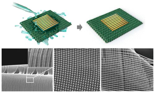 在此項(xiàng)工作中,Jun-Ho Jeong和Inkyu Park研究團(tuán)隊(duì)采用具有良好生物相容性和室溫下溶解性的透明質(zhì)酸作為供體基底;同時(shí)透明質(zhì)酸可高精度復(fù)制在硅片上加工好的納米結(jié)構(gòu)。首先,透明質(zhì)酸模具可以容易地制成納米線,納米點(diǎn)和納米孔等納米結(jié)構(gòu)的模具。其次:將各種金屬或SiO 2被沉積在有圖案的透明質(zhì)酸薄膜上。最后,把薄膜鋪在潮濕的紡織基材上,透明質(zhì)酸溶解,并且將設(shè)計(jì)好的納米結(jié)構(gòu)的功能材料轉(zhuǎn)移到紡織物材料表面。采用這種工藝,金屬或非金屬微/納米尺度的圖案可以轉(zhuǎn)移到任意非平面上織物的表面,同時(shí)保持其形狀。此方法加工的最小精度是50納米。