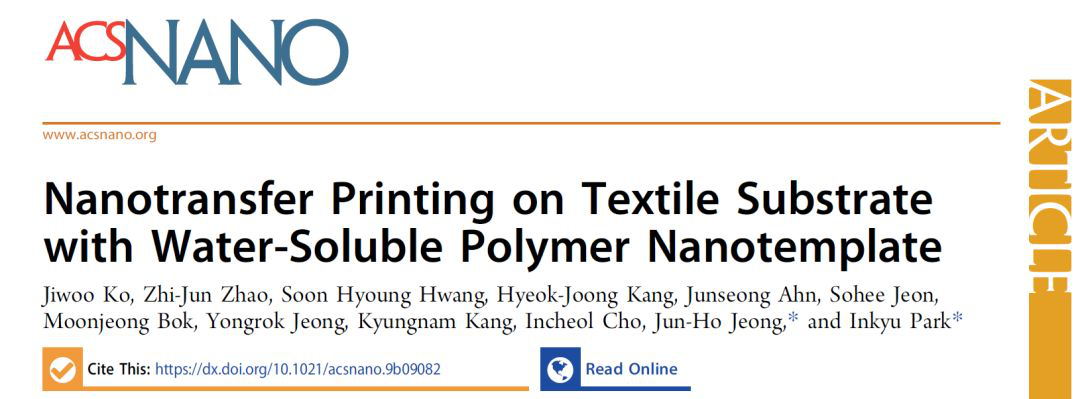 為了解決以上提到的局限性,韓國科學(xué)技術(shù)院Jun-Ho Jeong和Inkyu Park研究團(tuán)隊(duì)開發(fā)了 一種基于簡(jiǎn)單的轉(zhuǎn)印方法:通過在具有水溶性的供體襯底上沉積納米結(jié)構(gòu),然后在轉(zhuǎn)印步驟后溶解水溶性的供體基底,可以簡(jiǎn)單地把納米尺度精微結(jié)構(gòu)的功能材料納米結(jié)構(gòu)的轉(zhuǎn)移在紡織材料基底上。此項(xiàng)工作題為:“Nanotransfer Printing on Textile Substrate with Water-Soluble Polymer Nanotemplat”,于2020年1月28日發(fā)表在最新的《 ACS Nano》上。