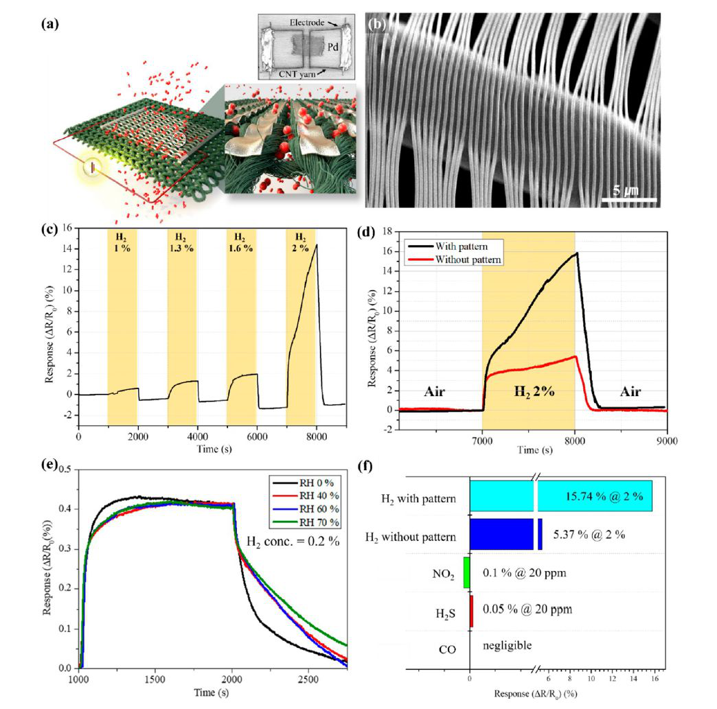 圖示二:nTP-SP工藝在制備檢測(cè)氫氣的Pd納米結(jié)構(gòu)中的應(yīng)用:(a)氫氣感測(cè)原理圖,使用紡織襯底的傳感器;(b)納米結(jié)構(gòu)的L/S為200nm /200的SEM圖像,在織物襯底上制備納米材料; (c) 對(duì)于H2檢測(cè)的(ΔR / R 0 )響應(yīng)曲線;(d) 比較Pd納米粒子和薄膜轉(zhuǎn)移到紡織基板上的響應(yīng)曲線; (e)傳感器在不同相對(duì)濕度條件下對(duì)H2響應(yīng)(070%);(f)各種氣體(NO 2 、H 2 S、CO)的選擇性測(cè)試。