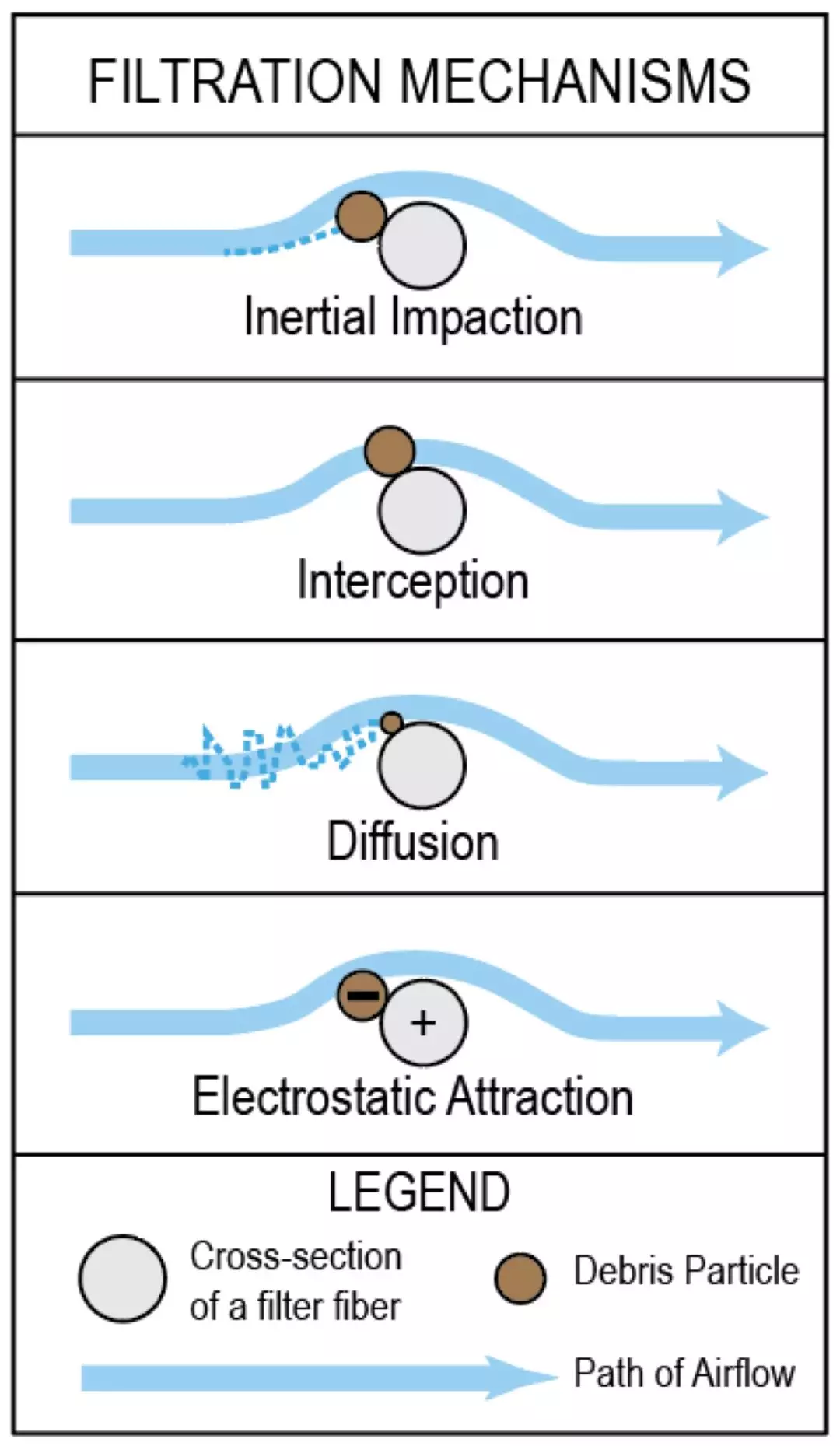 · 擴(kuò)散 —— 當(dāng)粒子尺寸極小時,受隨機(jī)粒子運(yùn)動(小粒子的布朗運(yùn)動)控制,運(yùn)動方向脫離氣流方向,碰到纖維時被吸附。