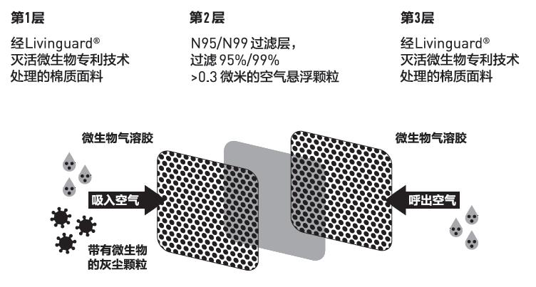 該口罩通過Livinguard專利技術(shù)從外層開始提供3層保護(hù),在紡織物的外層涂上了抗病毒制劑,并完美地融入織物本身。